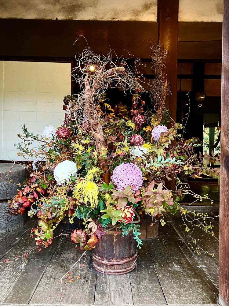 使い古した、味わい深い桶の中にどっさり生けられた華々しい花の数々。🤩