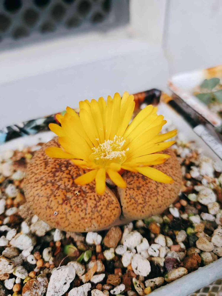 DAISO産のリトープスに黄色いお花が咲きました🌻