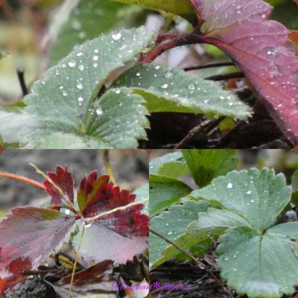 昨夜から 雨☔️が降ったり止んだり、庭のイチゴ🍓の葉にも雨粒が付いています。