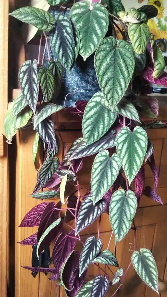 上あ、きれいな紫色♥️金時草みたいな色合いだけど表は斑入りみたいな紋様だし、ポトスみたいに垂れてる🎶これは絶対吊り鉢ですね🆗