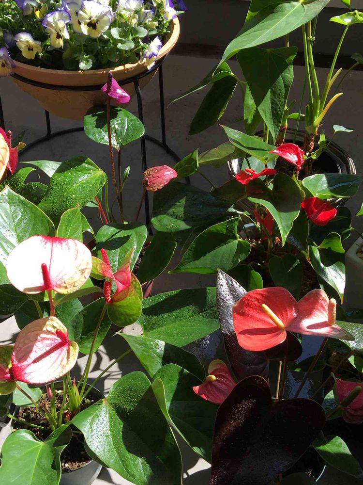 ☀️が出て気温も上がって来たのでアンスリウムのチビ軍団も葉水していっぱい日を浴びてます。他のアンスリウムと同じようように大きくなってねー😁