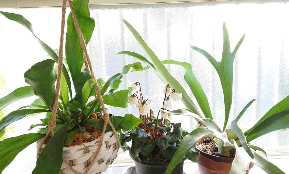 良くあるコウモリランと良くあるんだろうけど名前が分からないビカクシダとアウトレットのシクラメン。