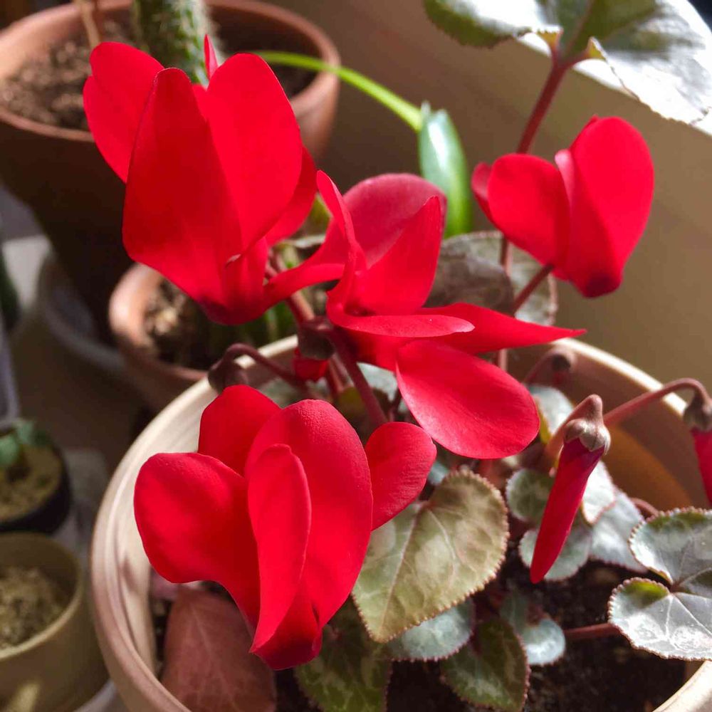 1月中旬頃のミニシクラメン。一昨年からの株で2回目の開花。ベランダから室内窓辺に移動させたら、今では花モリモリ。