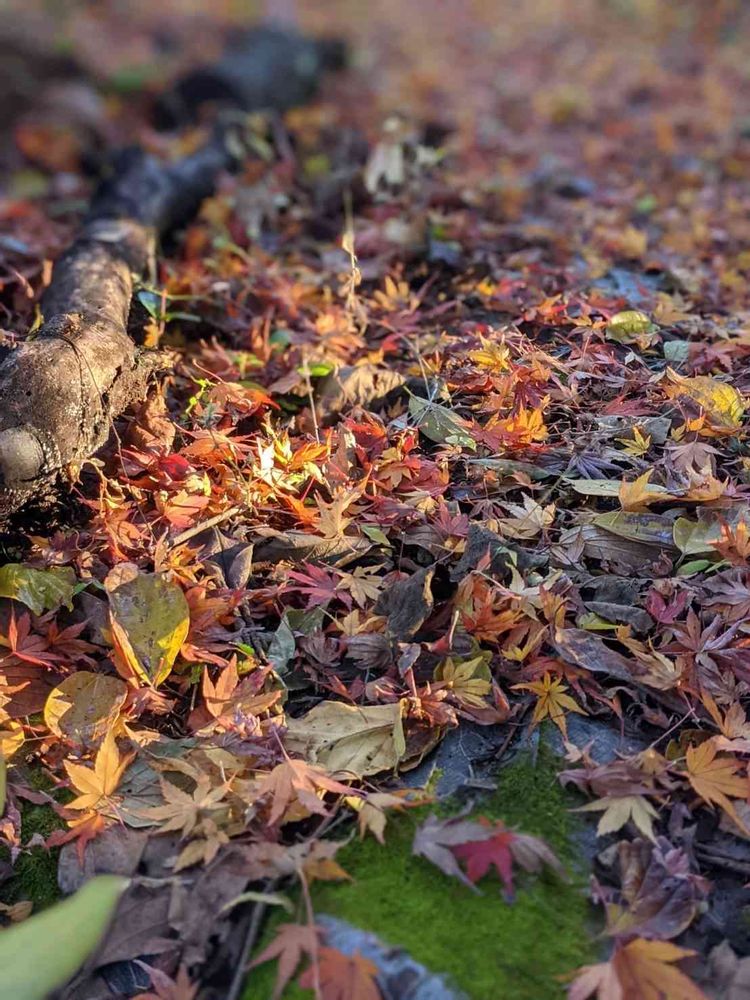 朝、昨日の大雨で沢山落ちたイロハモミジの葉に陽が差していました。