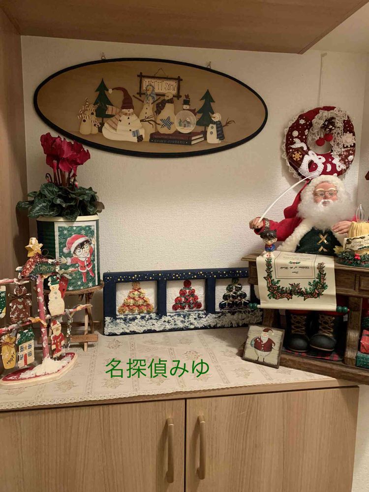 後ろのスノーマンのはお友達がトールペイントしたのをいただいて、木のタペストリーとツリーとリースは私が手作りしたものです😊