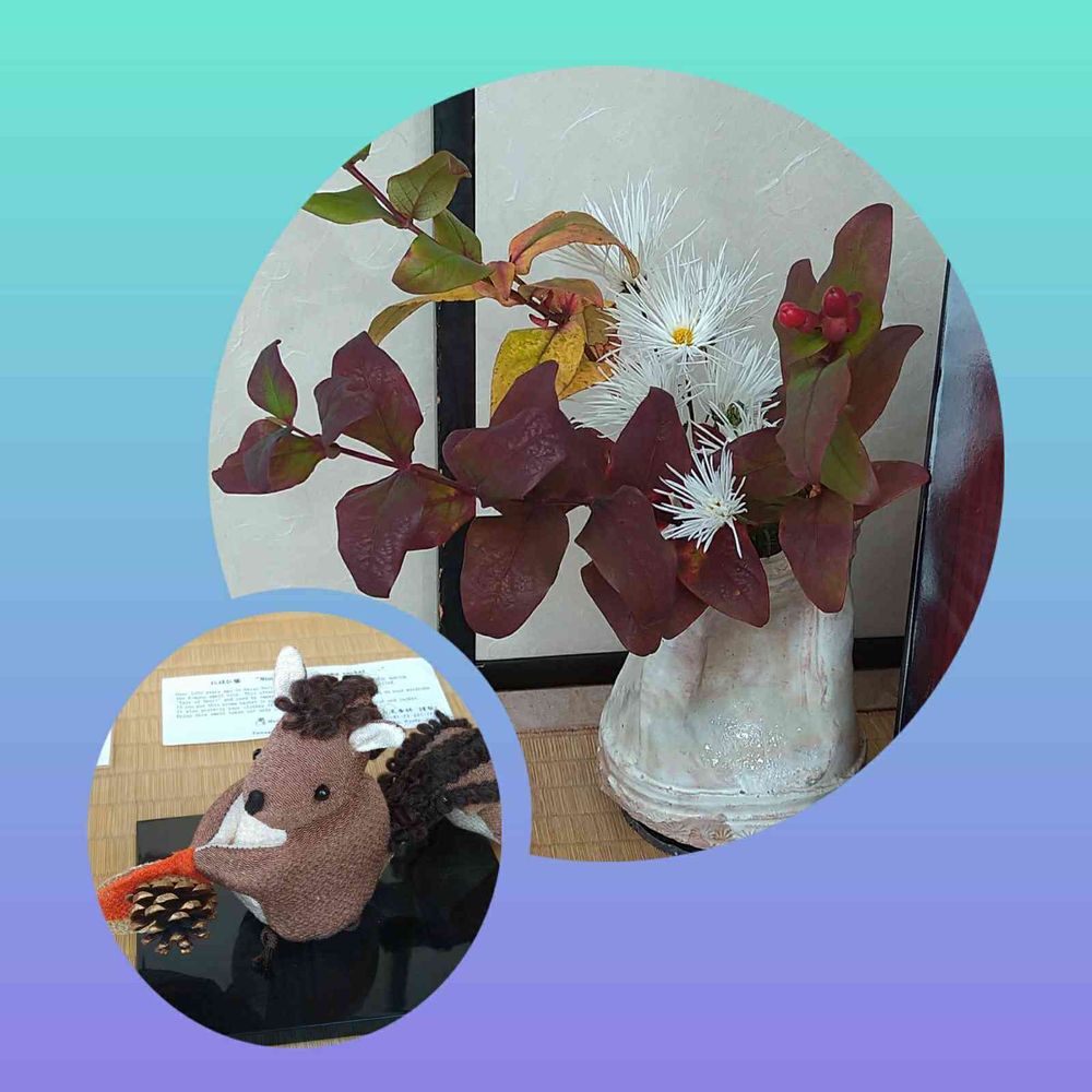 ちりめん細工のお店のウインドーに飾られていた、素敵な生け花とちりめんで作られている可愛らしいリス🐿ちゃんです😍💖