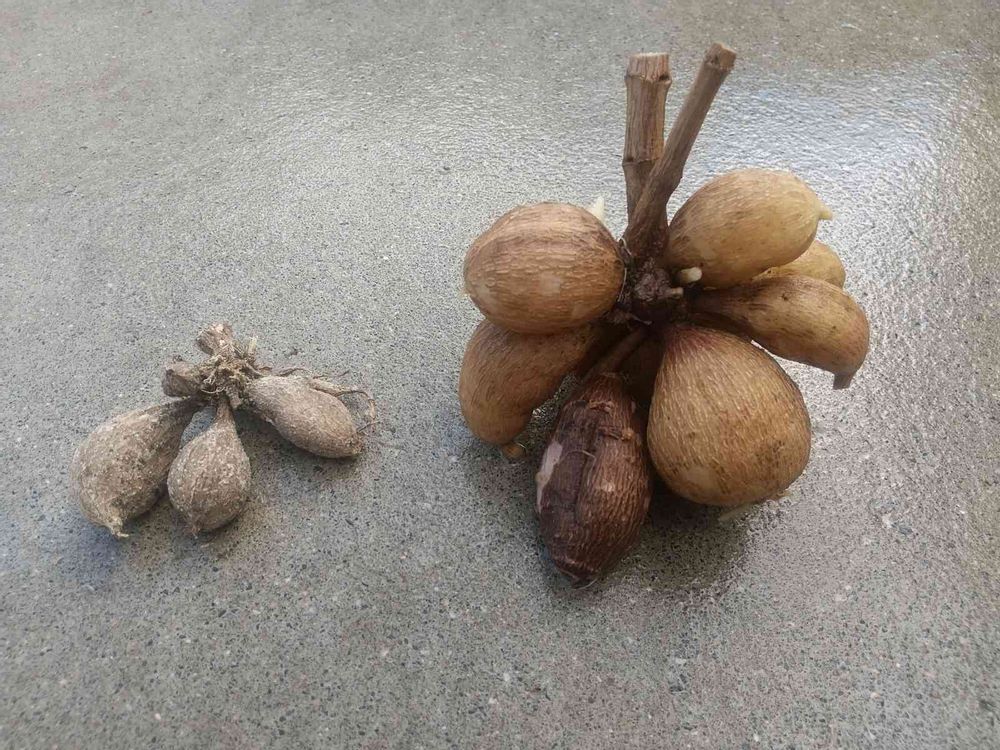 面白すぎて思わず米ぬかに沈めていた子を掘り出してきましたよ。いやはや、同じ植物の球根とは思えませんな。