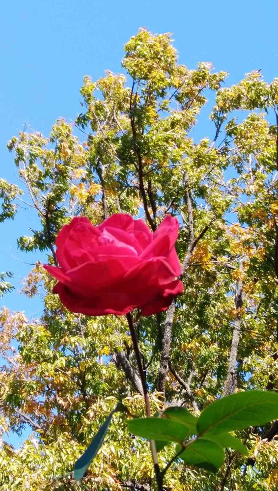 青い空、黄葉、赤い薔薇、緑の葉、鮮やかに映えてまだまだ暖かさを感じます。