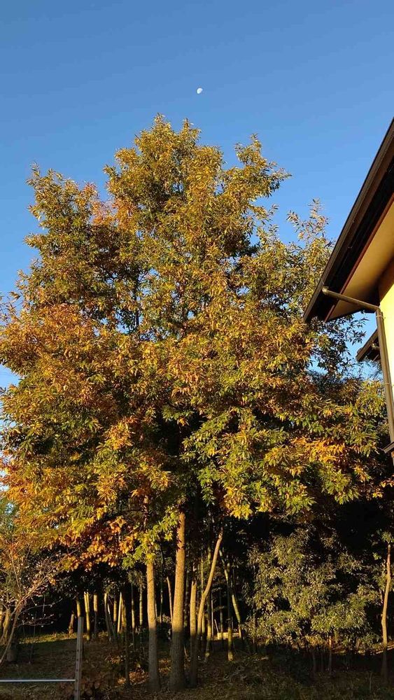 朝のお月さまって、好きです🌖白くて透き通るようで、とってもきれいですよね✨けやきの紅葉とも、相性バッチリですね😃