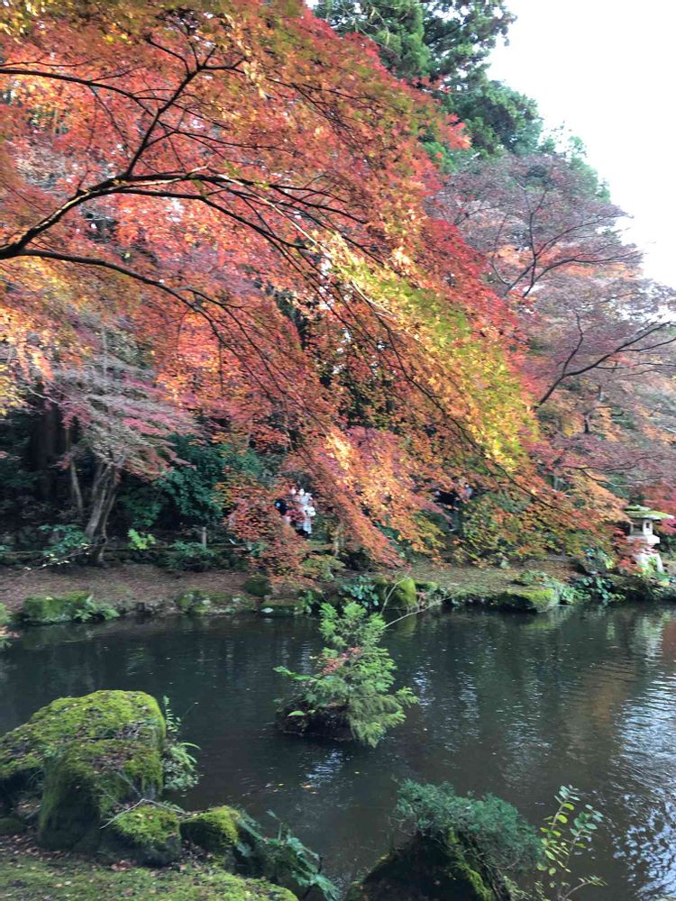 苔むした岩、池に泳ぐ鯉、紅葉した木々……
