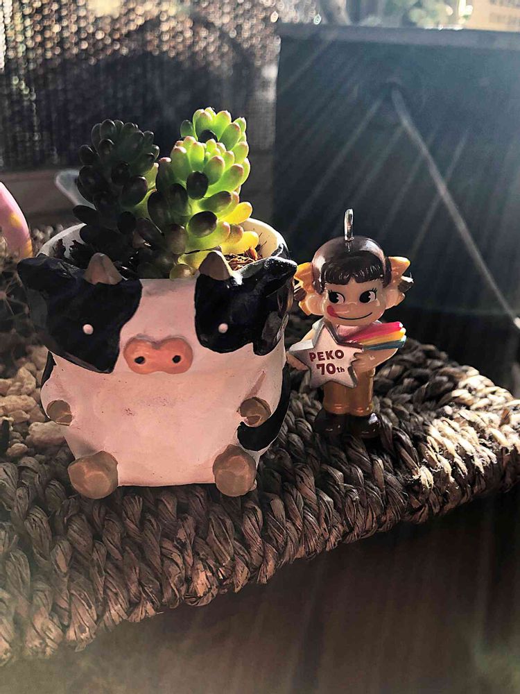 個性的な🐮さんですね。小さいんですね。ペコちゃん。いっぱい集めたの全てリサイクルショップに売ってしまった後悔してます。