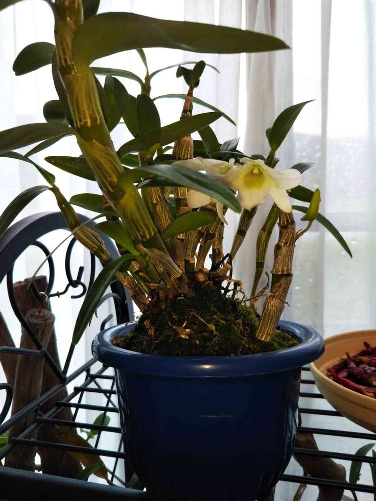 息子の出窓に置いてます「デンドロビューム エンゼルベイビーグリーン」寒い中健気に咲いてました。🤔20日水やった時は確か蕾です😉暗いから📱に点灯しながら撮しました。早いみたい😊
