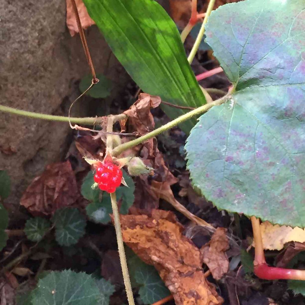 フユイチゴに実がなったので、小躍り中🎶2020年2月に道路脇に雑草化していたのを貰ってきて地植え(今年9月10日に花をUPしてます)。食べてみたら、酸味が勝つものの、みずみずしくて美味💕