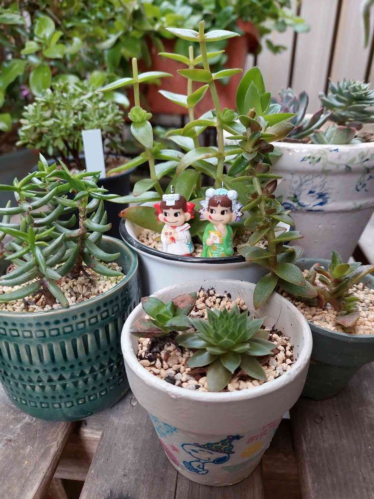 華ちゃんから頂いたたくさんの多肉チャンの中で楽しそうなペコちゃん達💕💕
