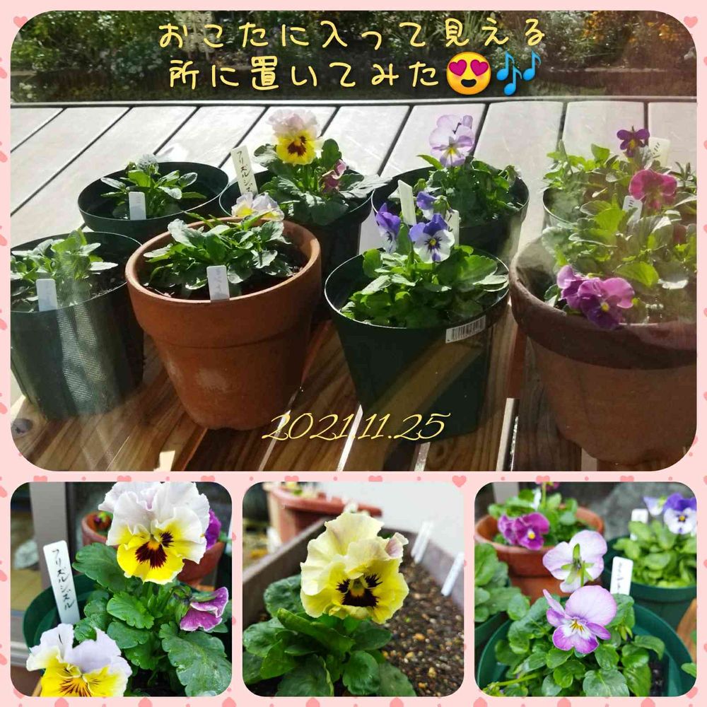 咲いてるのと咲きそうなビオラちゃん達を家の中からおこたに入って眺められるところに並べてみたよ❣️