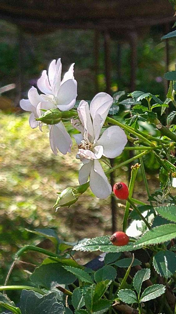 お庭に陽が差して、ほんのりピンクも見える白いミニバラさんの花びらが透けてとってもきれい…。