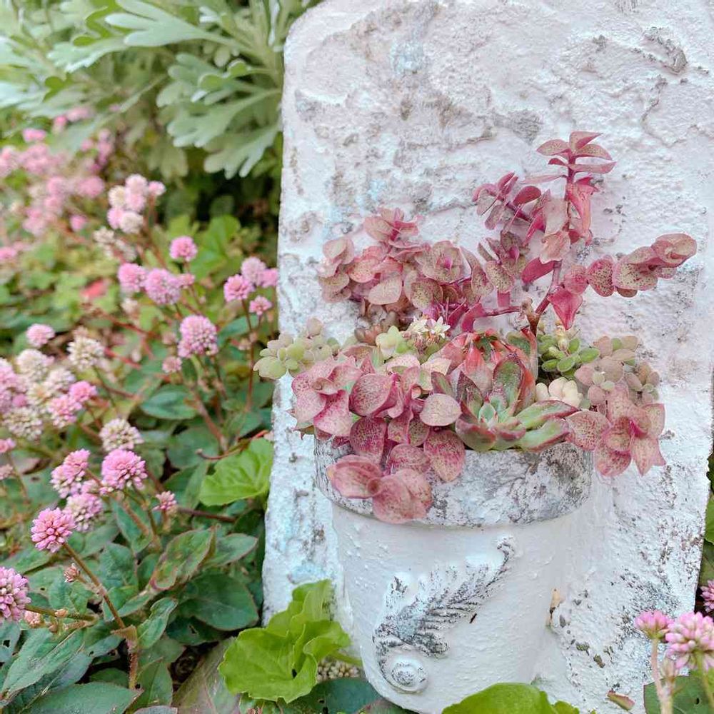 立て掛けモルタルプレート鉢に寄せ植えした子がいい暴れ具合に⸜(*ˊᗜˋ*)⸝