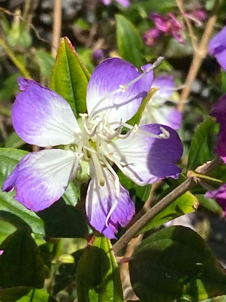 花色 咲き始めが白(花弁基部〜中頃)と青紫(花弁中部〜先端)の2色で、順次、薄桃、濃桃へと変化します。(三色野牡丹)