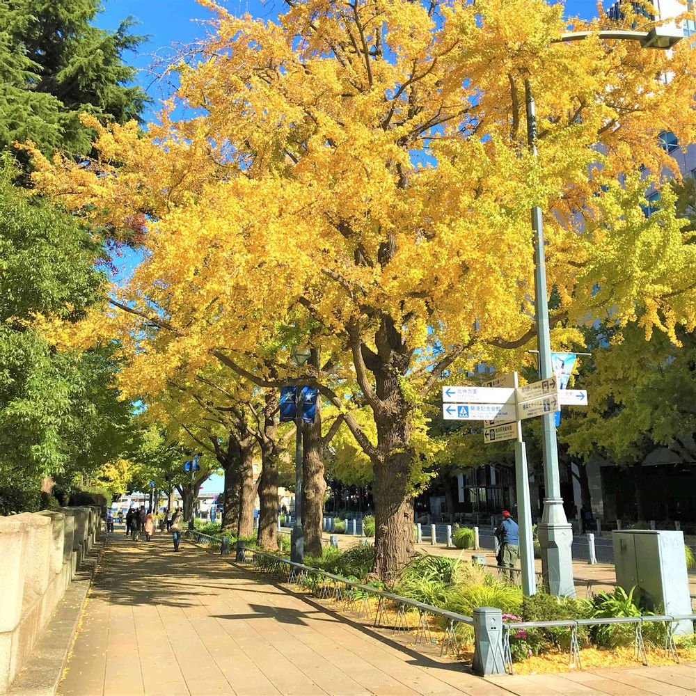 日本大通りでは、イチョウが色づいている様子が見られます。