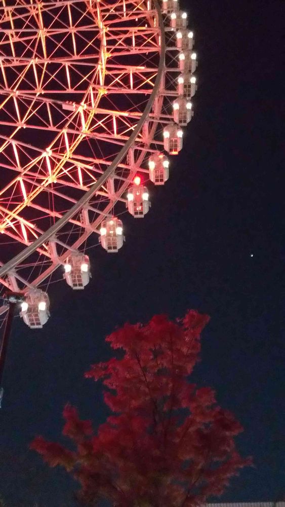 大観覧車の前の「カエデ」が真っ赤になり、夜空に金星⭐️が見えます。🎡♥️🌃🌌😊😄🤗