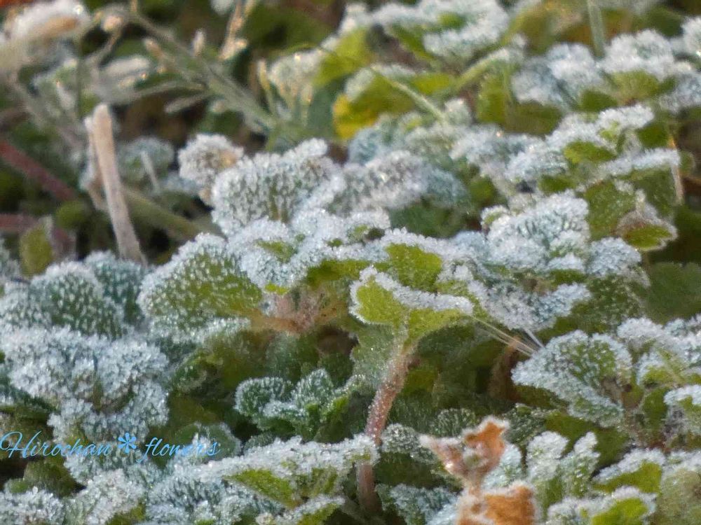 オオイヌノフグリの葉に、真っ白な霜が降りていました💦