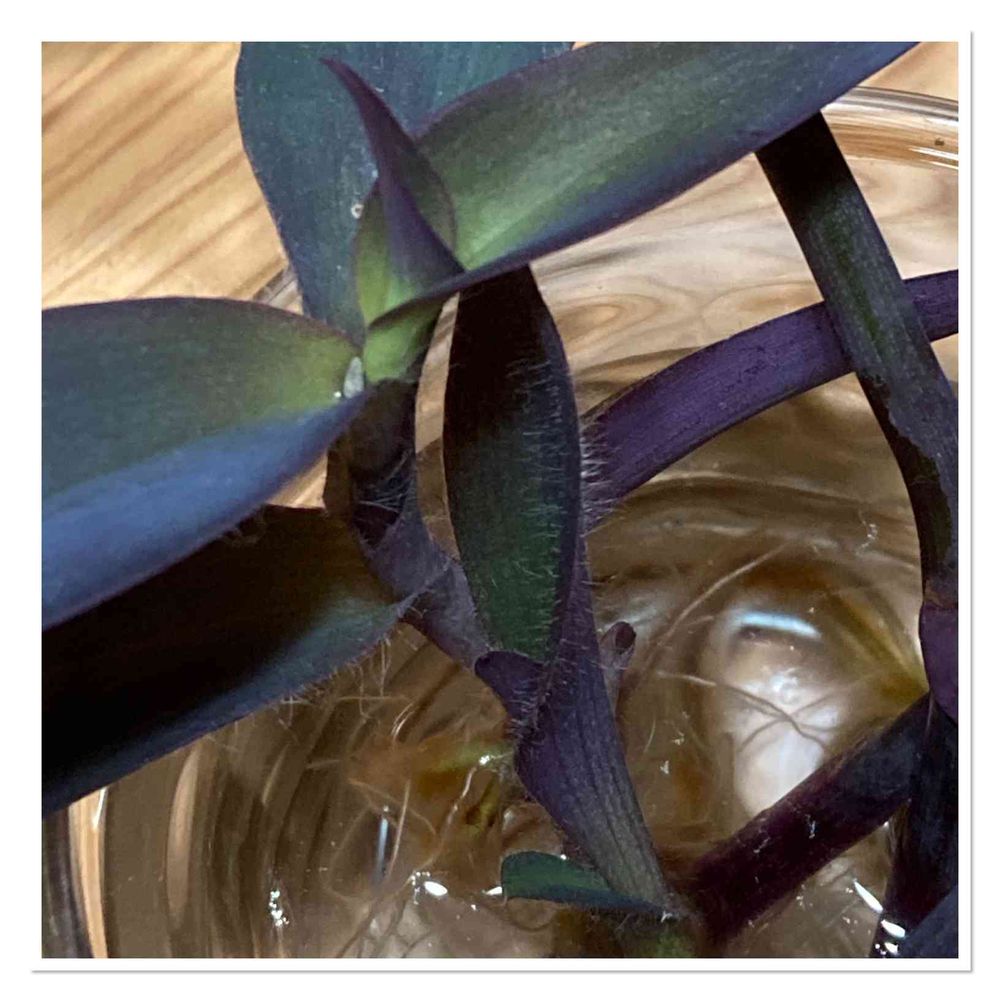 コップに挿したムラサキゴテン、根が結構伸び、新しい葉も出てきた。よく見るとうぶ毛のようなものが生えている。これにより葉色が変わって見えるらしい。