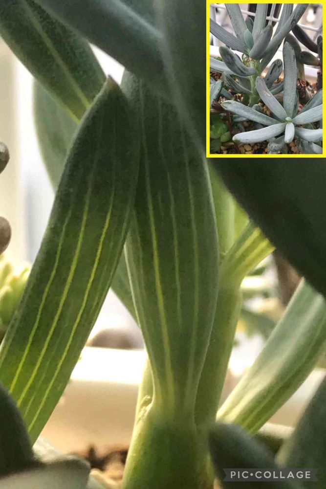 ニョロンと伸びた青白い葉に白粉をまぶし、縦線の窓が模様のように見えます。