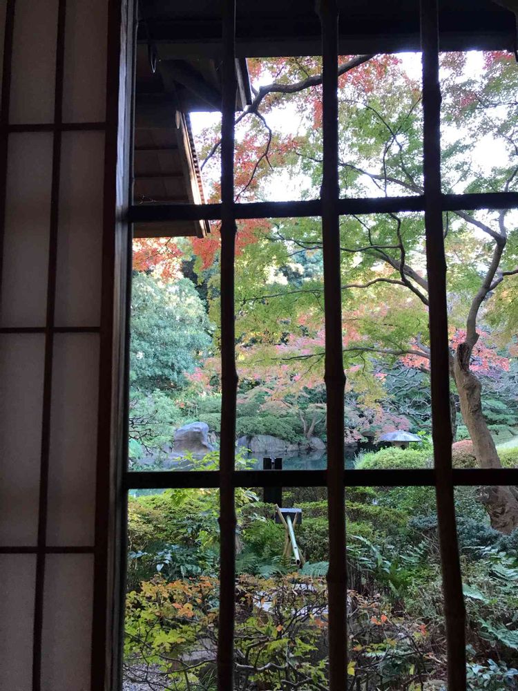 茶室の黒い窓枠から垣間見える秋が、美しいです😃