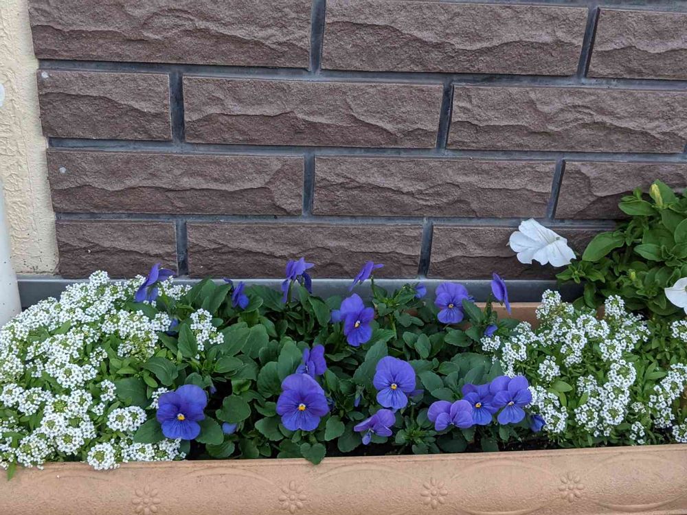 白いアリッサムとブルーのビオラからスノードロップが出てきたら素敵よね🎶