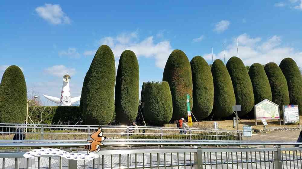 後ろに見えるのが万博公園のシンボル「太陽の塔」だよ。
