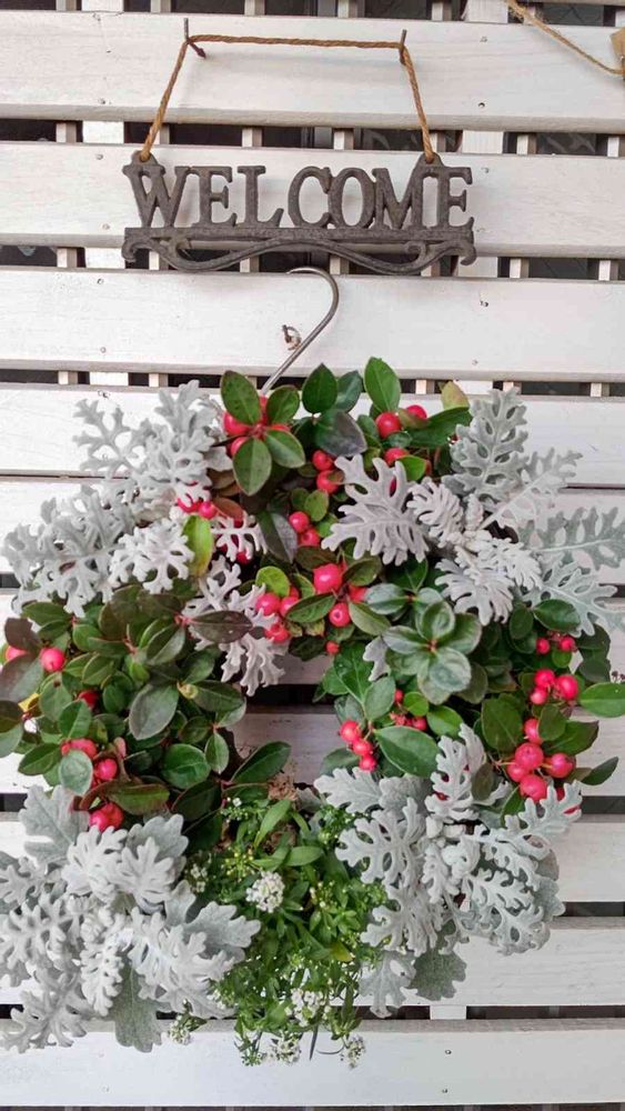 赤い実🍒と緑の🌿、白い❄️のようなシロタエギクで良い感じのリースになりました🤗