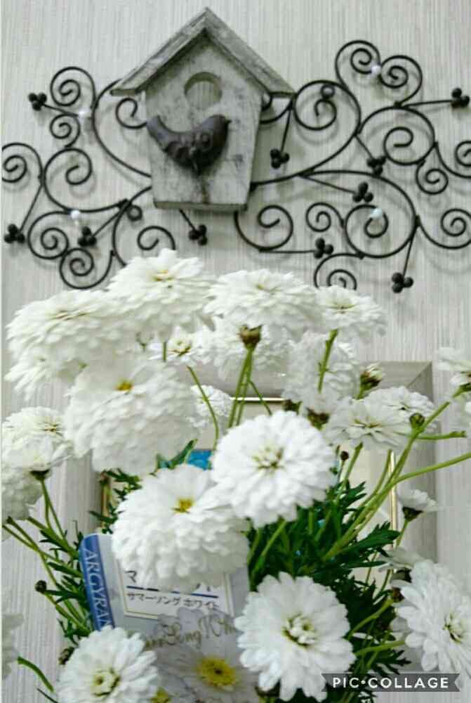 ((アリガトウ♡))q•ᴗ•⸝⸝)オブジェは壁に掛けてあるので主人にマーガレット持って貰って写真撮りました💕🐦のオブジェ意外と大きくて横が40cmあります。お気に入りでーす🤗