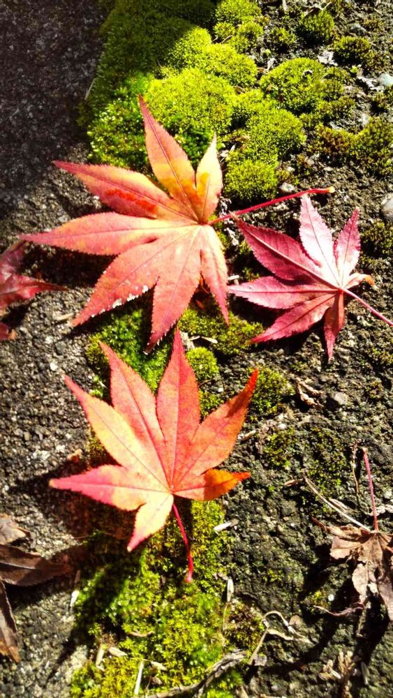庭の苔の上に落ちたモミジの葉🍁🍁🍁