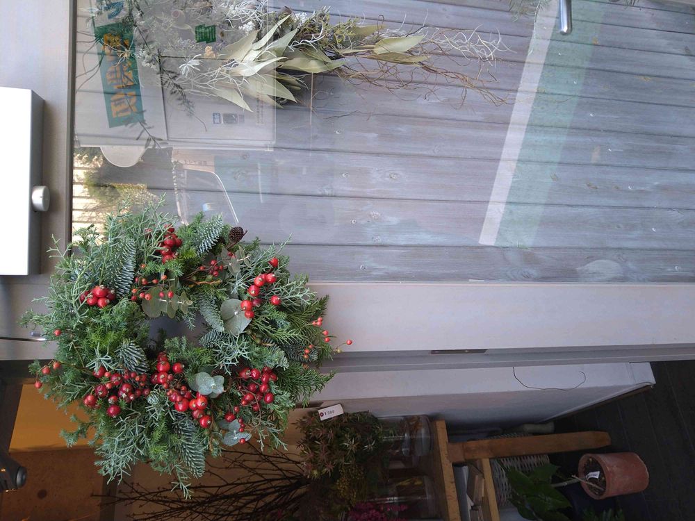 バラの実とグリーンリーフ、ヤシャを使ったリース。クリスマス感強目です。