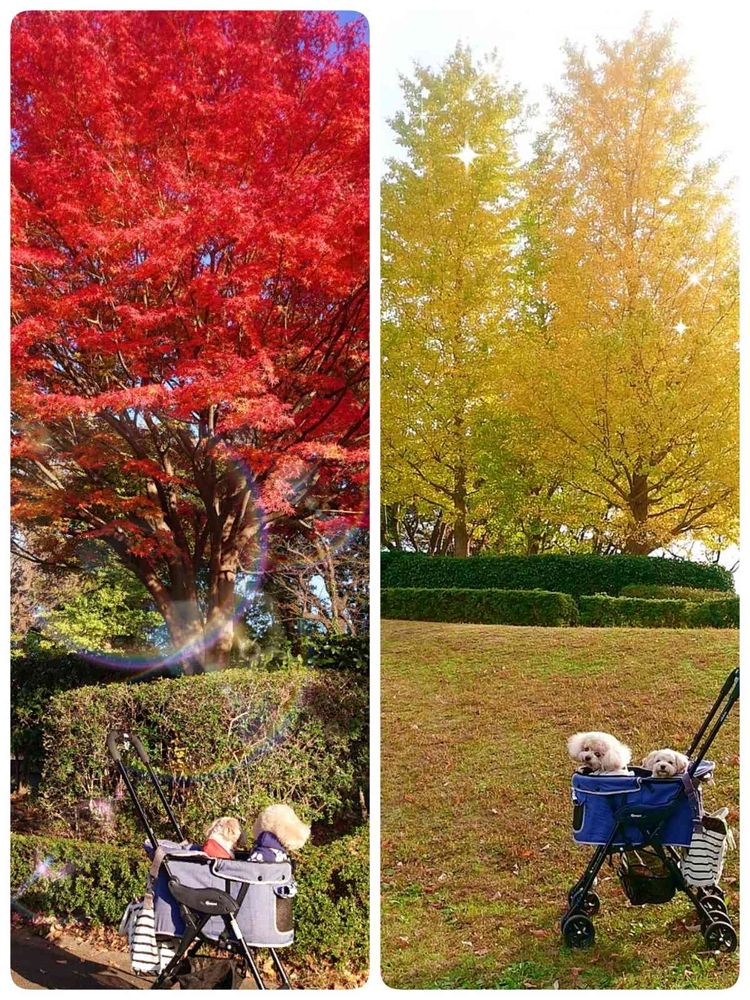 くぅ🐶とゆめ🐶のお散歩コースで よく行く公園の いちょうの木ともみじの木。。
