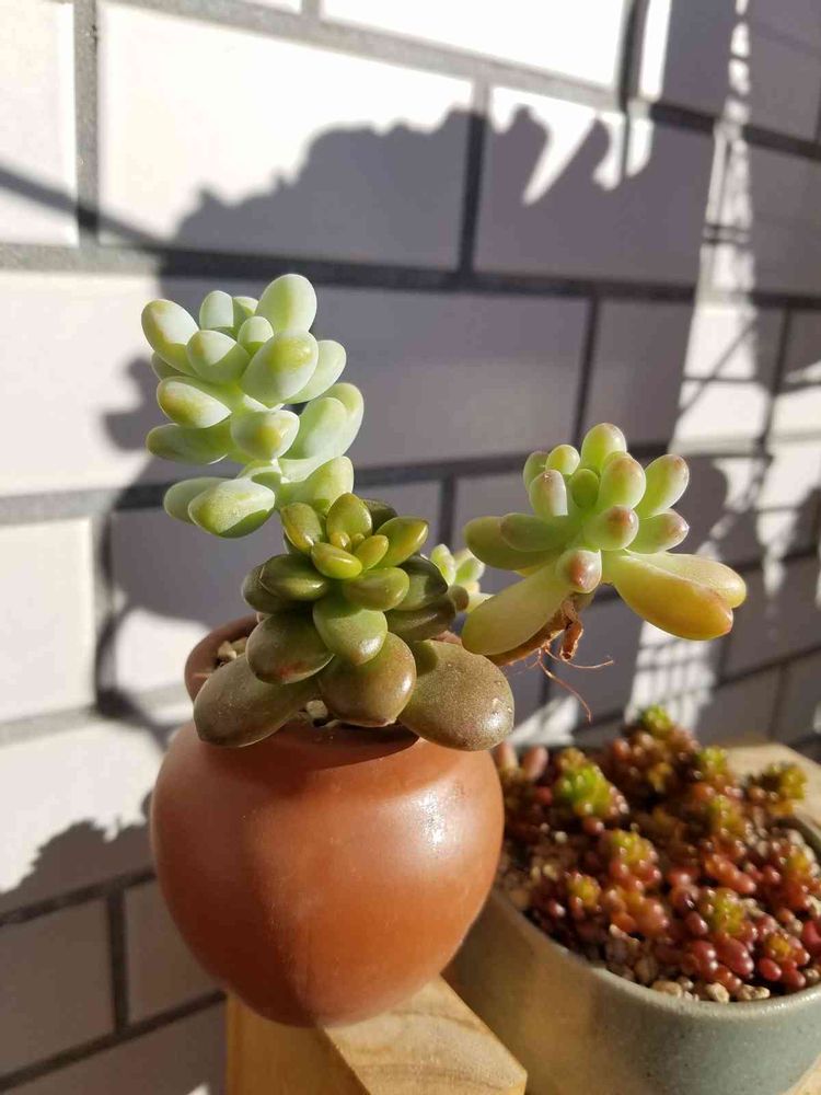 天使の雫、乙女心、松の緑をとあるメーカーのプリン🍮の空き容器に植えてます