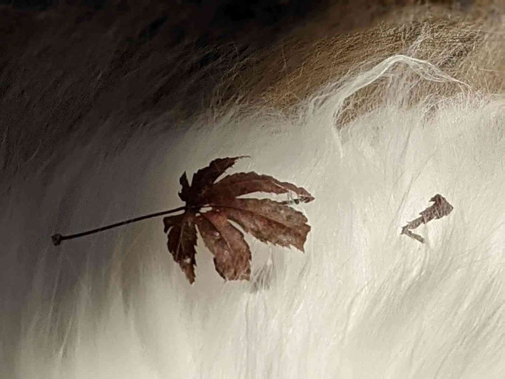 暖かいデッキでコロンコロンして私の足元に寛いでいるにゃんの身体に、モミジの葉っぱが…。