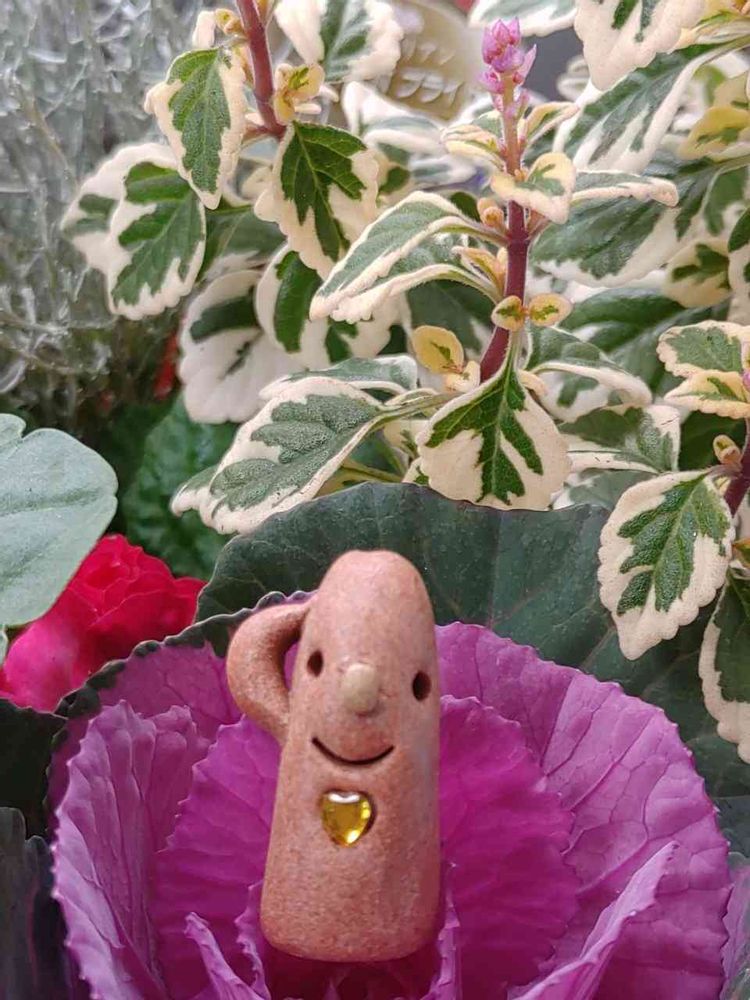 こんにちはハニワくん。もうひと月経ったのですね。今回もプレクトランサスの斑入りのニュアンスある葉っぱとコラボ、なかなかシャープに決まっていますこと!いつも以上にイケメンが押し出されていますよ。