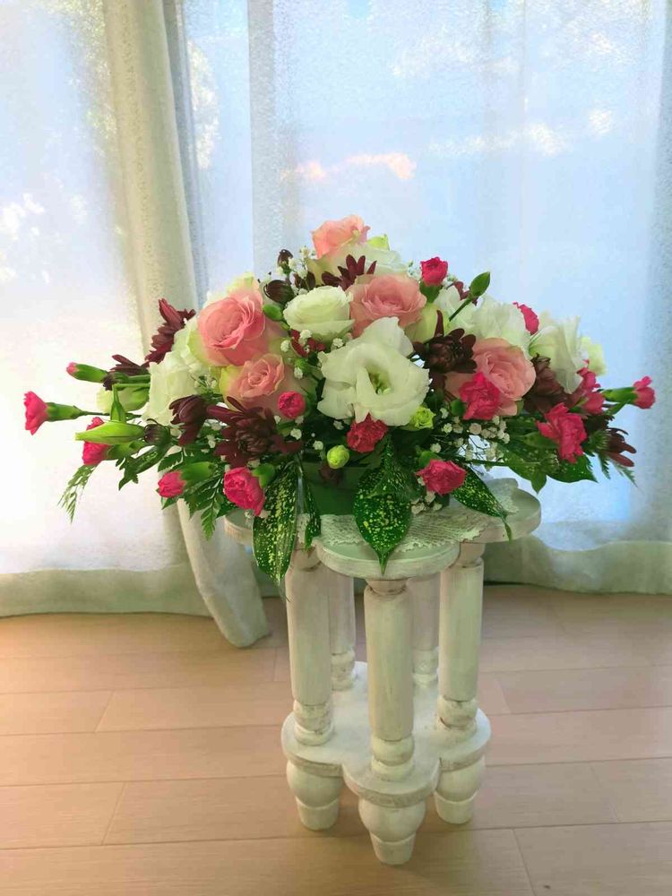 真っ白なトルコキキョウと優しいピンク色のバラそのお花達を濃い色合いの菊や、赤いカーネーションでしょうか?が周りを引き締めていて美しいです🎶💞