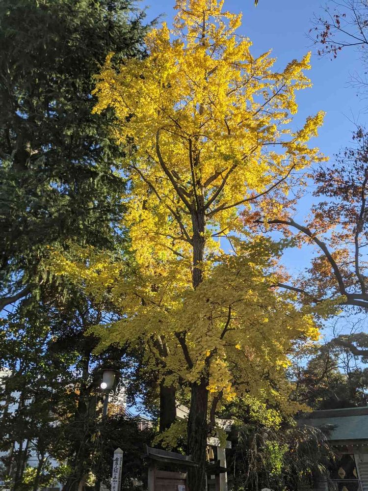 こんばんは。近所の神社の古いイチョウ、きれいに色づいていました。