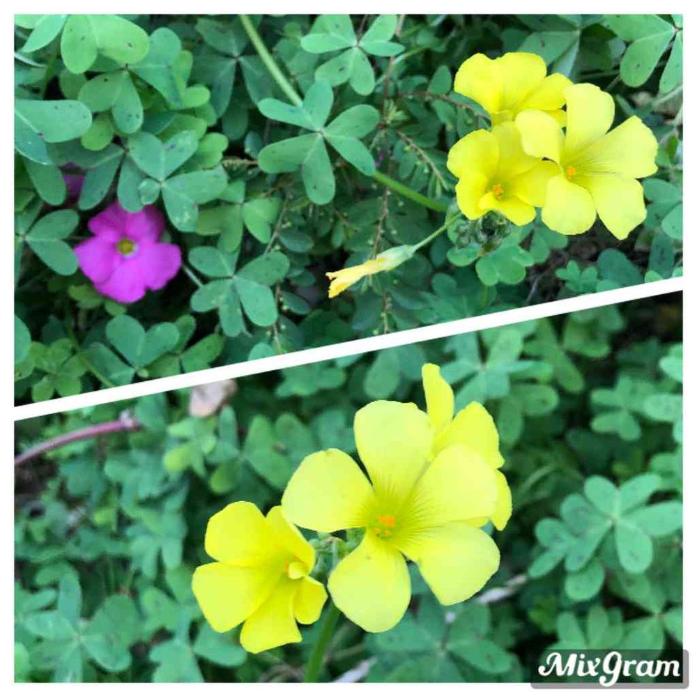 ピンクのオキザリスと黄色のオキザリスが混植されてるのですね😃同株ではないです。