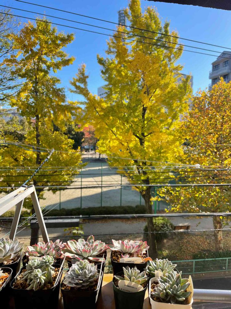 向かいのグランドの銀杏の木と奥の公園の🍁が綺麗に色付き今年もこれで見納めかな