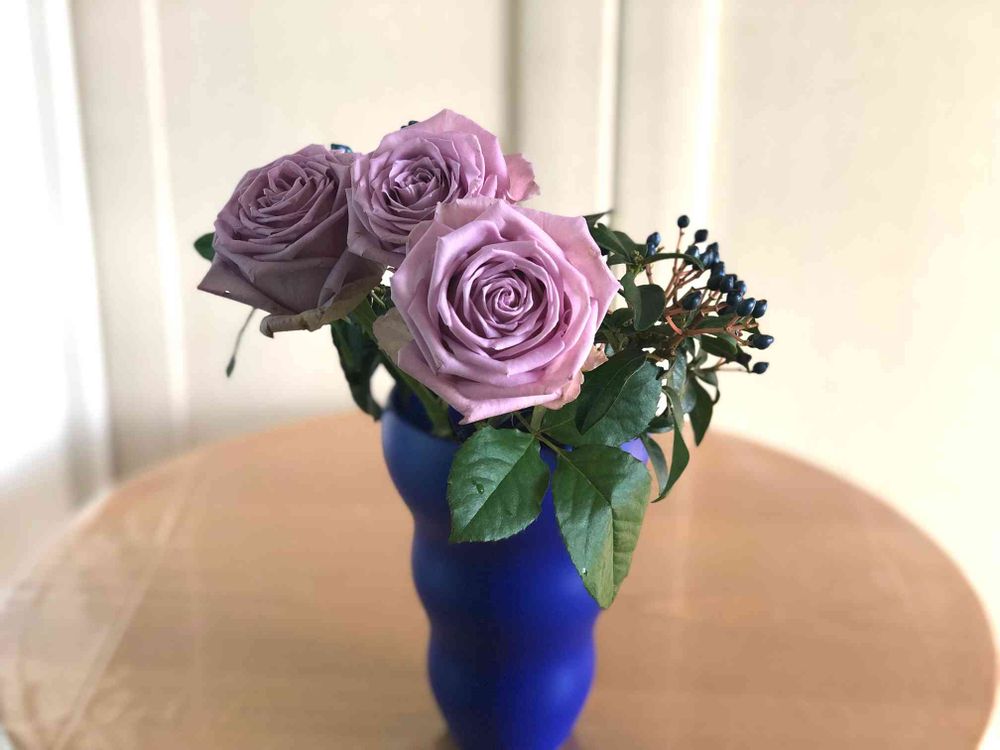 ステキな薄紫色のバラと青い実のビバーナムを購入。