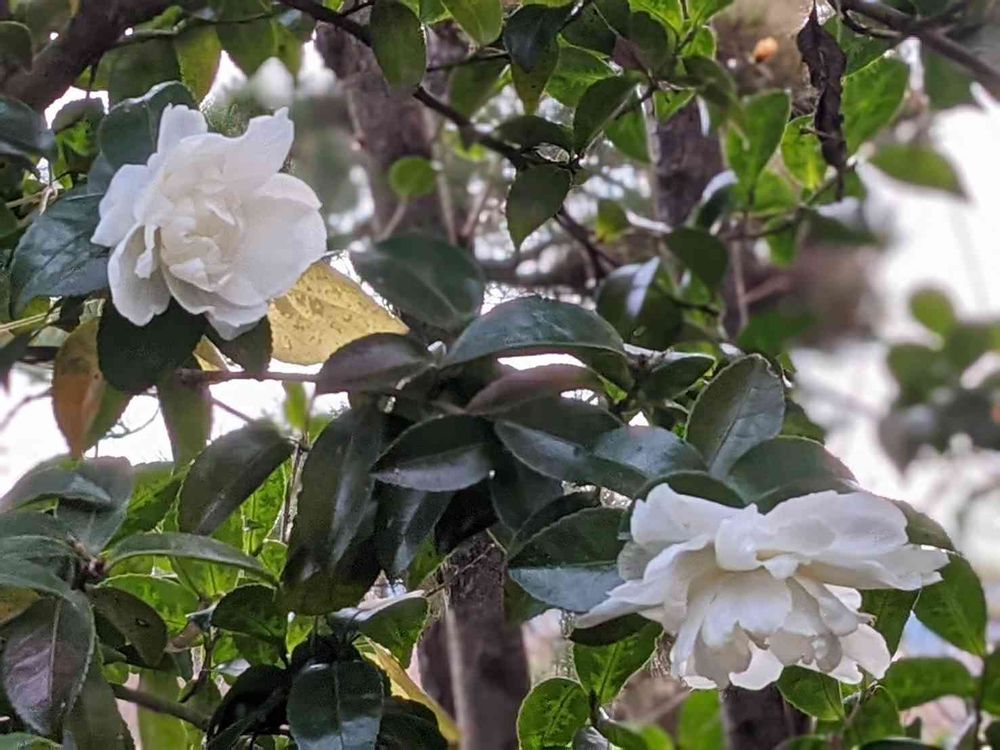 朝、アプローチの蕾だった白い山茶花のお花もきれいに咲いていました。