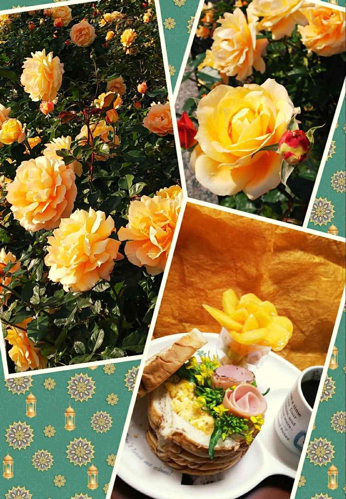 花寄せサンドです😊ローズハムにアスパラ菜を寄せて 季節のフルーツを添えました💕🎶