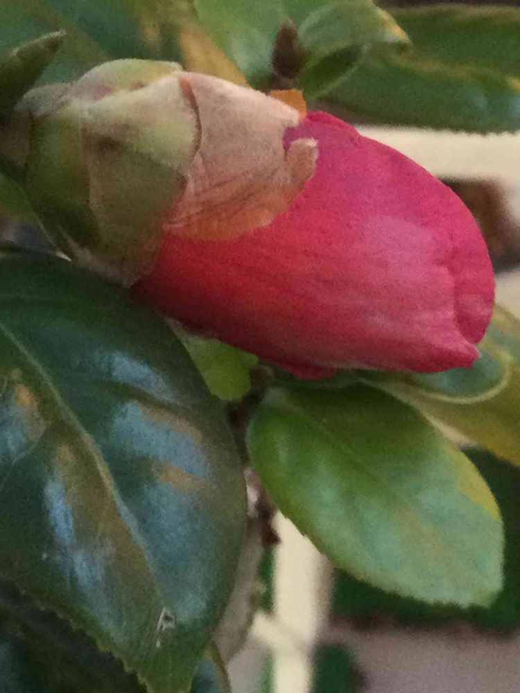 花のつかない庭に残った2本の椿の木を今年鉢上げしましたら、赤の蕾がつきました。