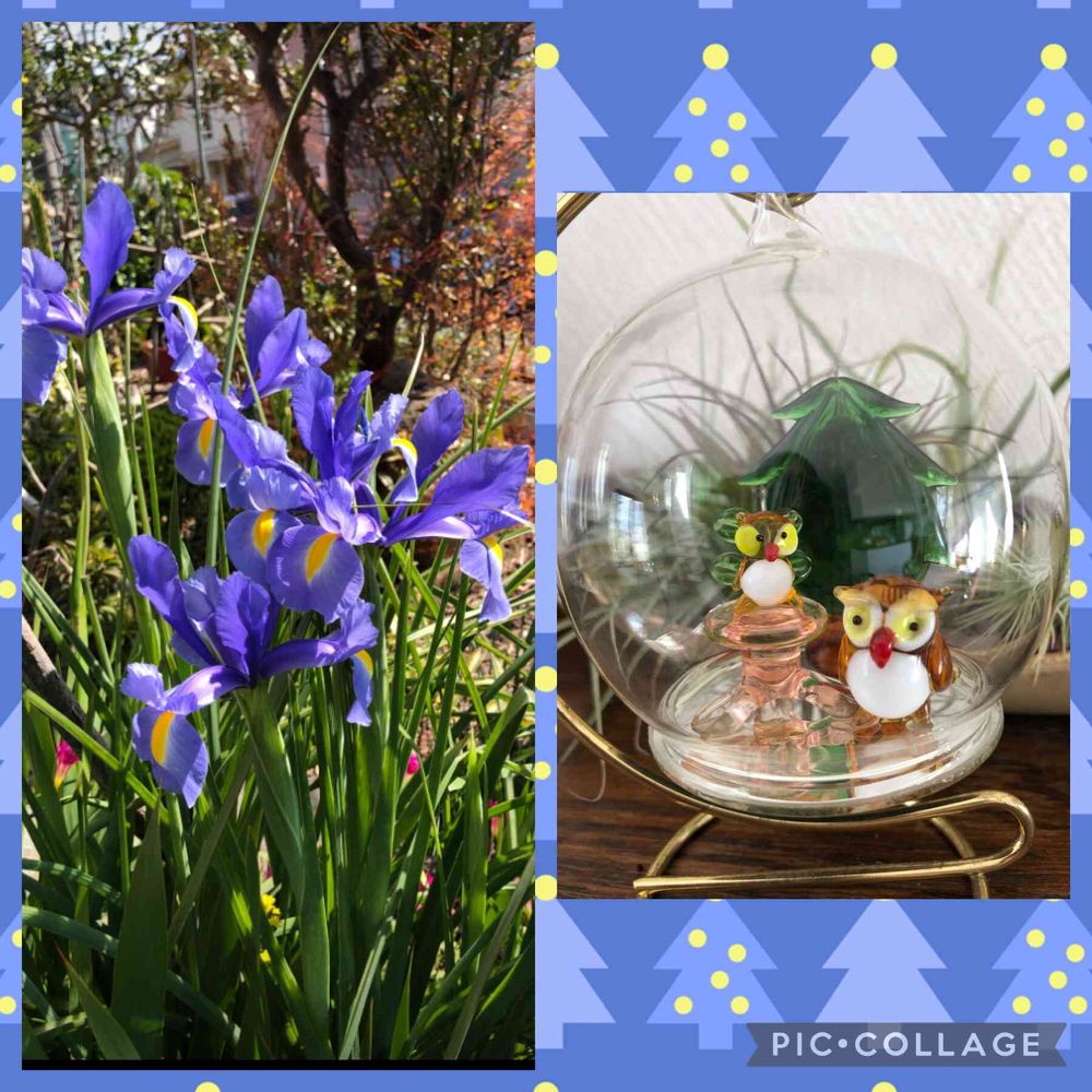 可愛いフクロウ!とアイリスの華やぎが一つの舞台で、魅力ある華やぎの世界を演出してるなぁー☺
