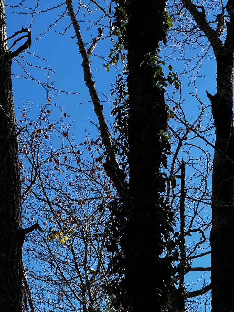 奥に見えるのは、柿かな?👀✨葉が落ちて、奥まで見えるようになっていました💡
