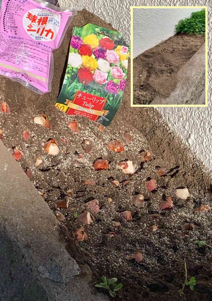 とにかくチューリップ球根を仕込まねば!っと3日前に花壇に50球の八重咲き🌷をギュウギュウ埋めました✨