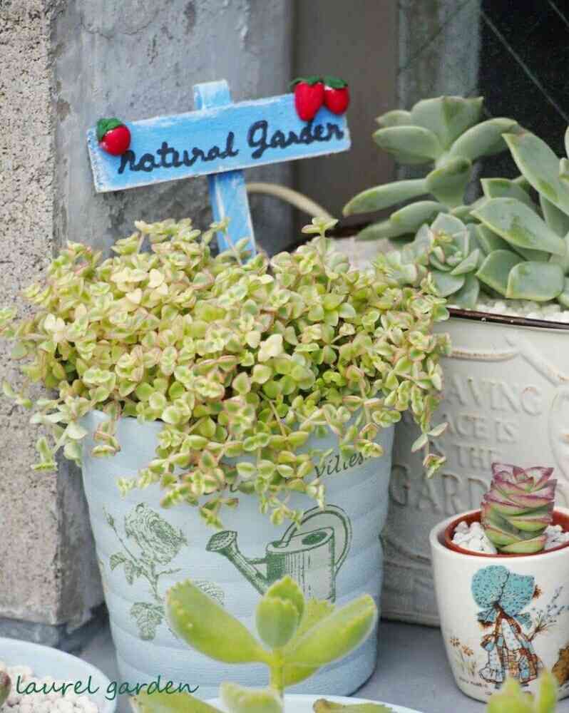 プラ鉢を水色に塗って、ペーパーナフキンの模様をデコパージュした鉢に差してみました💚(*°v°d)
